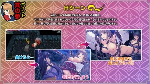 作为神乐系列特色之一的“与妖怪的异种交合”,本作将以此为核心,以亲民的价格提供轻松且深入的游戏体验。游戏中包含18种与妖怪的H场景,玩家可根据角色是否为处女、或是否曾被同一妖怪袭击过多次,体验到更为浓烈的H情节。此外,每次会聚焦于一位女主角,通过她与妖怪的H场景展现其性格、性感带等鲜明特点。