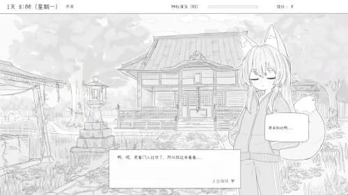 由于前任管理者去世,你被指派负责打扫家乡的神社。起初这只是个麻烦的差事,直到你遇见了神社的住客,狐娘万尾。她已经多年未与人类接触,对你十分警惕,但似乎也在默默认可你对神社的用心。